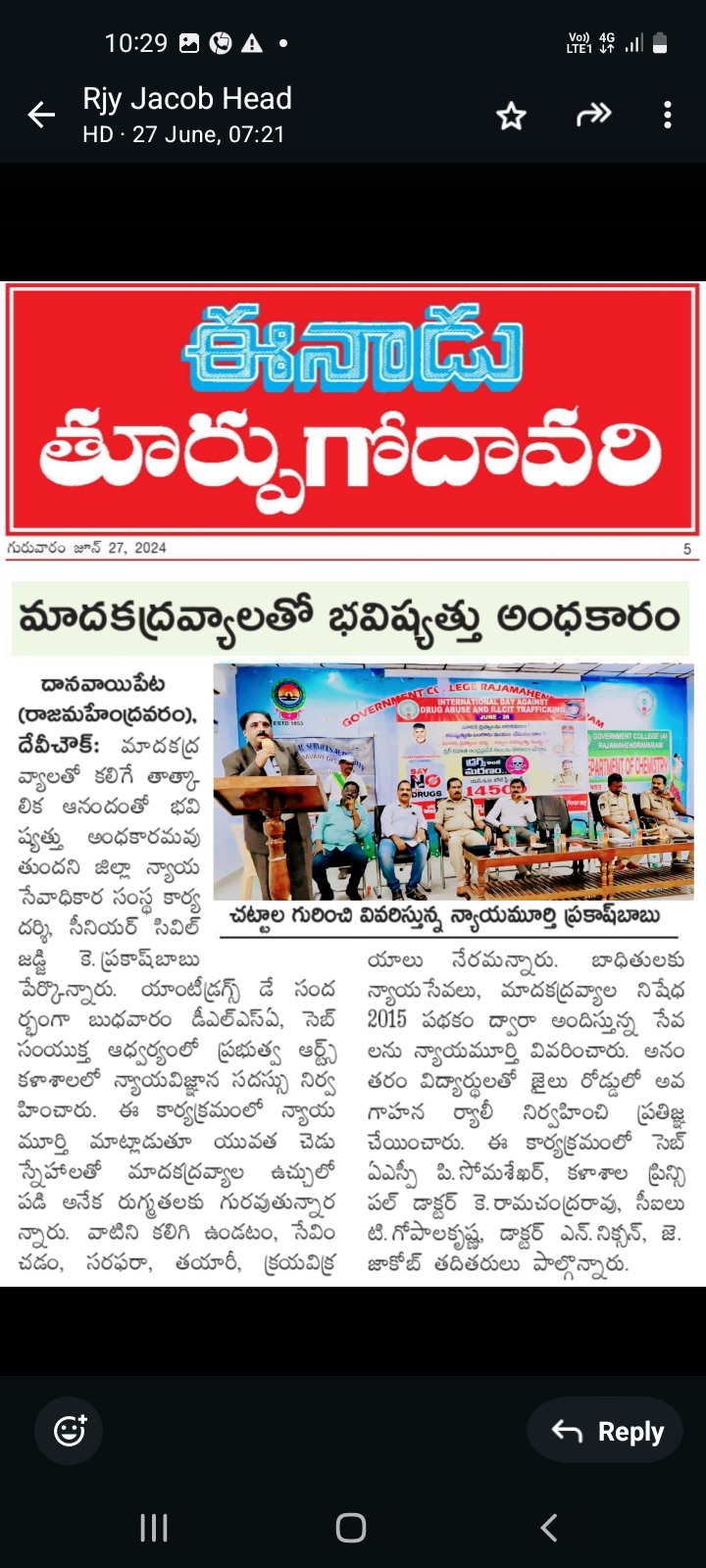 Department of chemistry Organizing International Day against Drug abuse and Illicit trafficking every year to create awareness among students