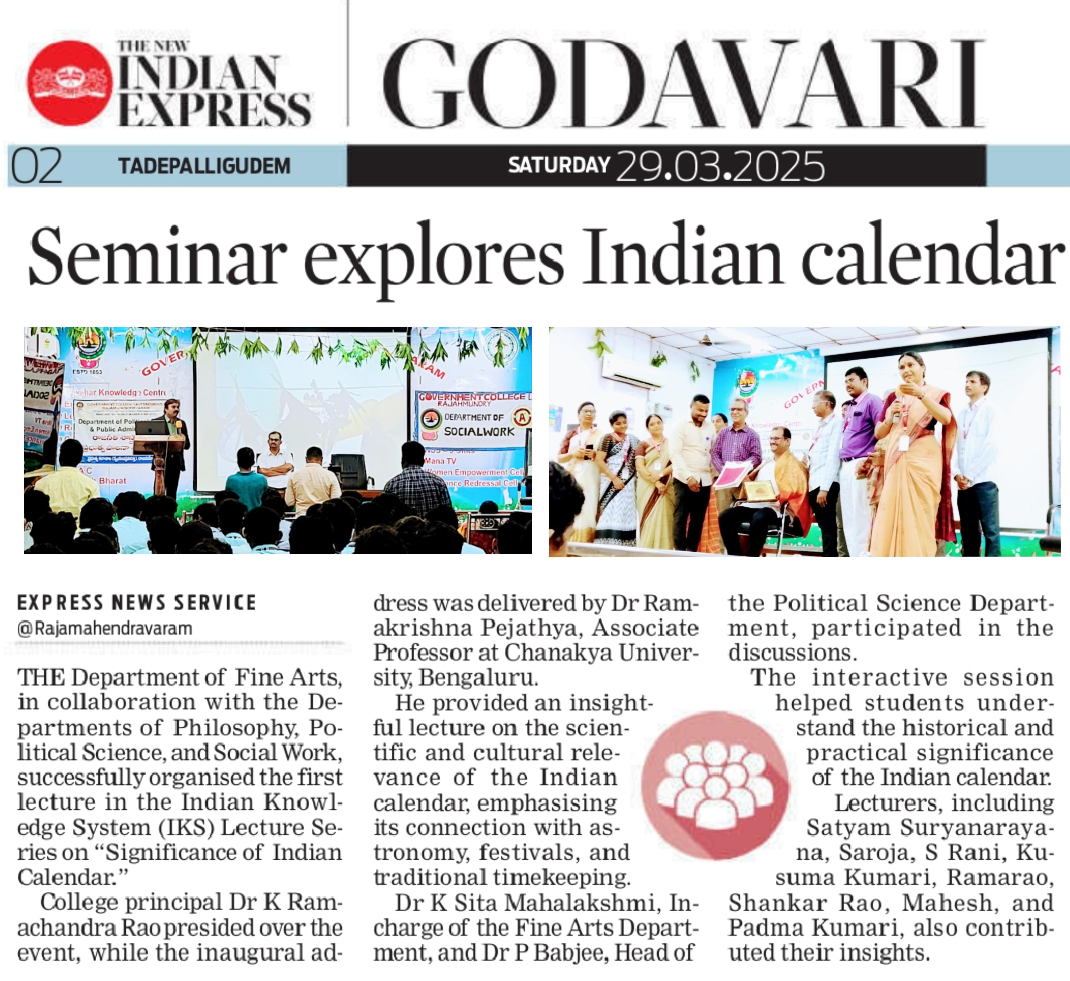 The Department of Lalitha Kalalu in collaboration of social work, Philosophy and Political science has conducted lecture series on the significance of Indian calendar prof: DR. RAMA KRISHNA PEJATHYA from Chanukya University Bangalore has delivered a message the importance of time and calendar.