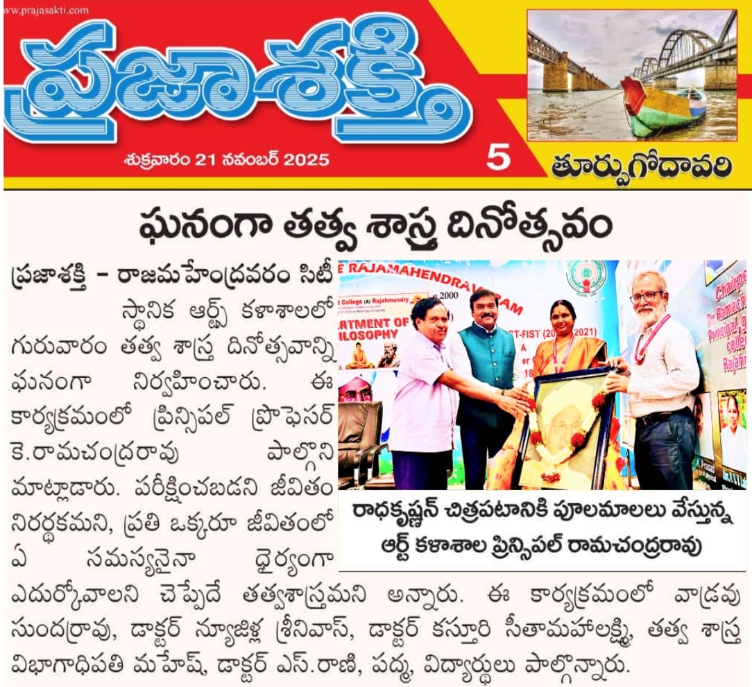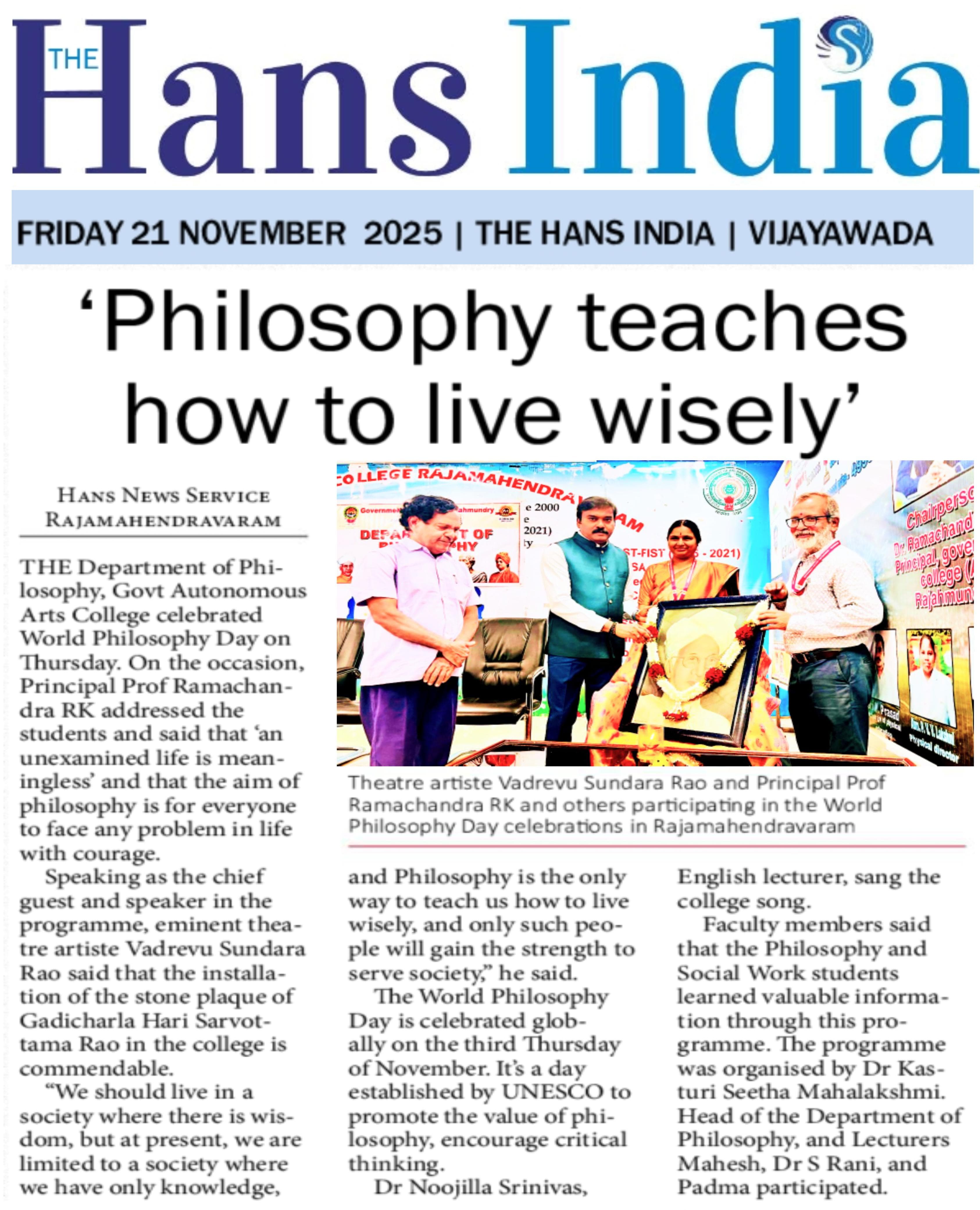 Report: World Philosophy Day Celebration (2025) Arts College Campus Date: 20 November 2025 The Department of Philosophy celebrated World Philosophy Day to highlight the importance of wisdom and critical inquiry in everyday life. Principal Professor K. Ramachandra Rao opened the event by emphasizing that "An unexamined life is worthless," urging students to use philosophical thinking as a guide. Key Highlights: * Chief Guest Address: Sri Vadravu Sundar Rao spoke on the transformation of alumnus Gadicharla Hari Sarvottama Rao into a freedom fighter. * Wisdom vs. Knowledge: The keynote stressed that while knowledge is abundant, philosophy is essential for developing the wisdom needed to serve society. * Cultural Segment: Dr. Nujilla Srinivas added harmony to the event by performing the Arts College song. * Student Engagement: Participants from Philosophy and Social Work departments explored the role of ethics in personal development. Conclusion: Organized by Dr. Kasturi Seetha Mahalakshmi and her team, the program reinforced the significance of building a socially responsible generation. The celebration successfully nurtured ethical awareness and a philosophical spirit among the students. Prepared by: Department of Philosophy Government College (A), Rajahmundry