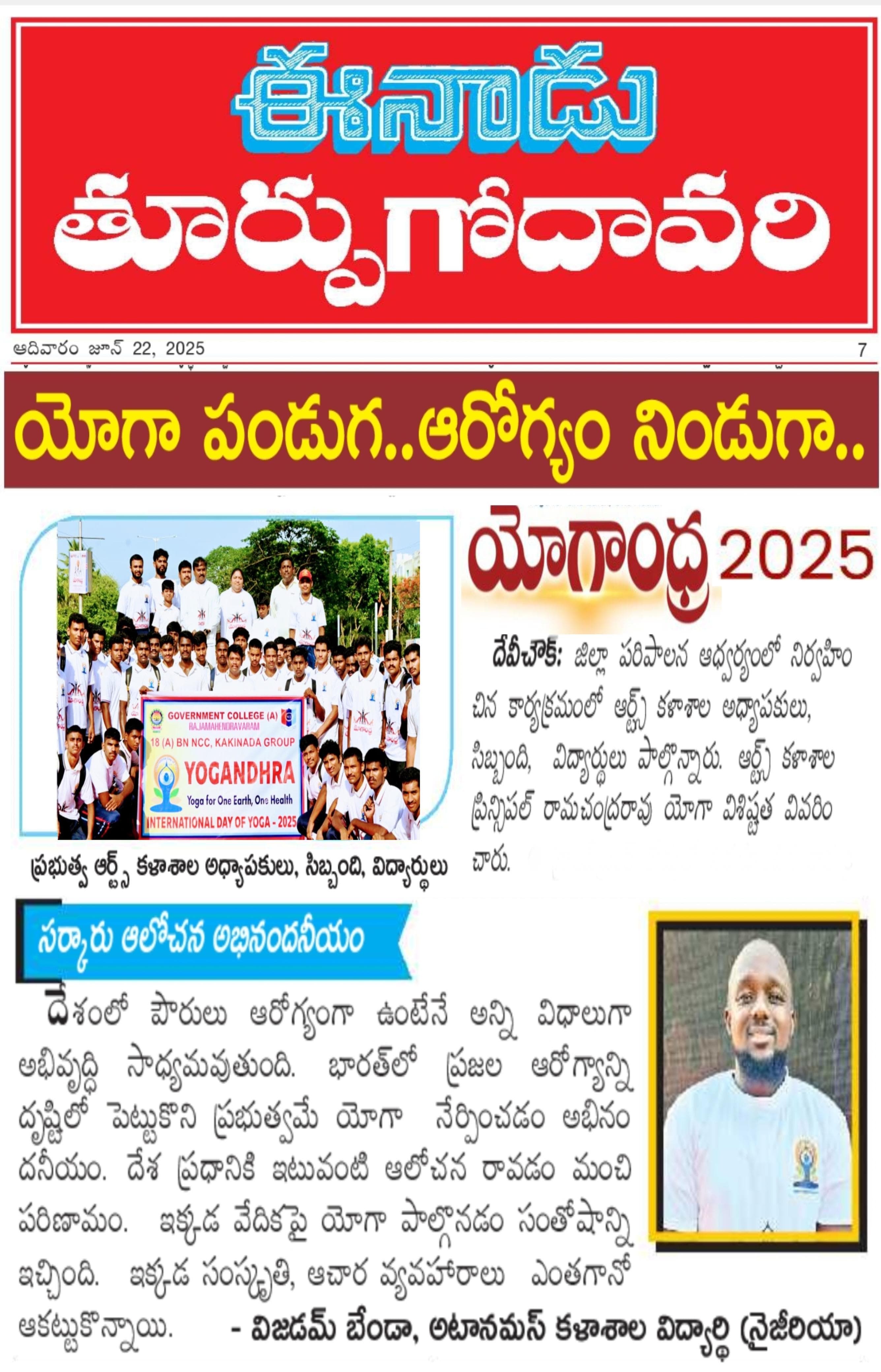 The participation of Government College (A), Rajahmundry in the International Day of Yoga 2025 was both impactful and inspiring. The college's substantial involvement significantly contributed to the success of the district-level event and supported the national movement to set a Guinness World Record.