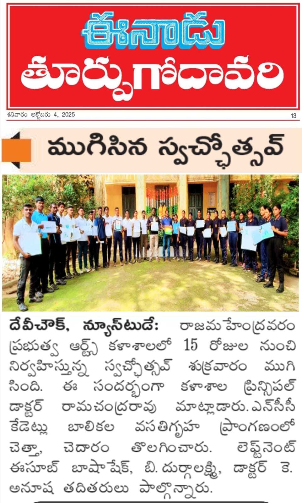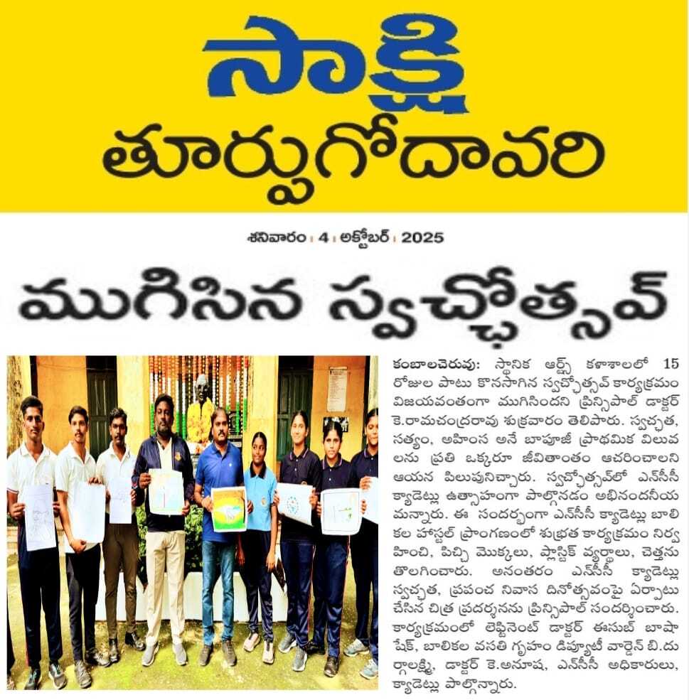 The programme was formally inaugurated on 17th September 2025 by the Principal, Dr. K. Ramachandra Rao, in the college campus. Throughout the campaign period, students enthusiastically took part in a variety of activities such as campus cleaning drives, blood donation camps, poster painting competitions, and awareness programmes on sanitation, recycling, and sustainable lifestyle habits.
