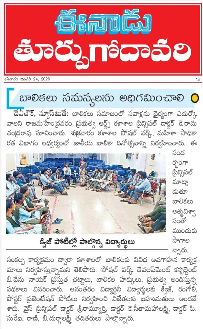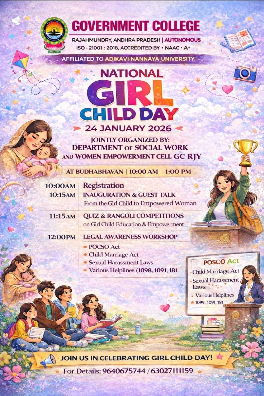 The Women Empowerment Cell (WEC) of Government College (Autonomous), Rajahmundry organized an awareness program on the occasion of National Girl Child Day on January 24, 2026. The program aimed to create awareness about the importance of the girl child, her rights, and the legal protections available for her safety and empowerment.