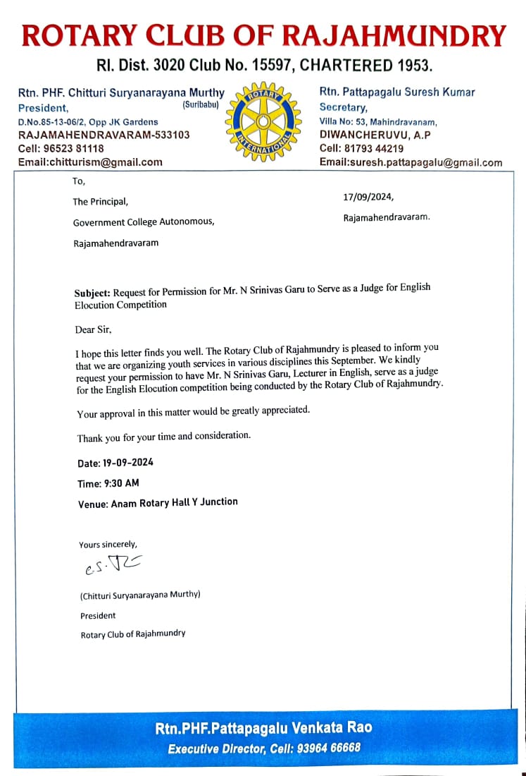 Acted as Judge for the Elocution competitions conducted by the Rotary Club of Rajahmundry as part of their Annual activities.