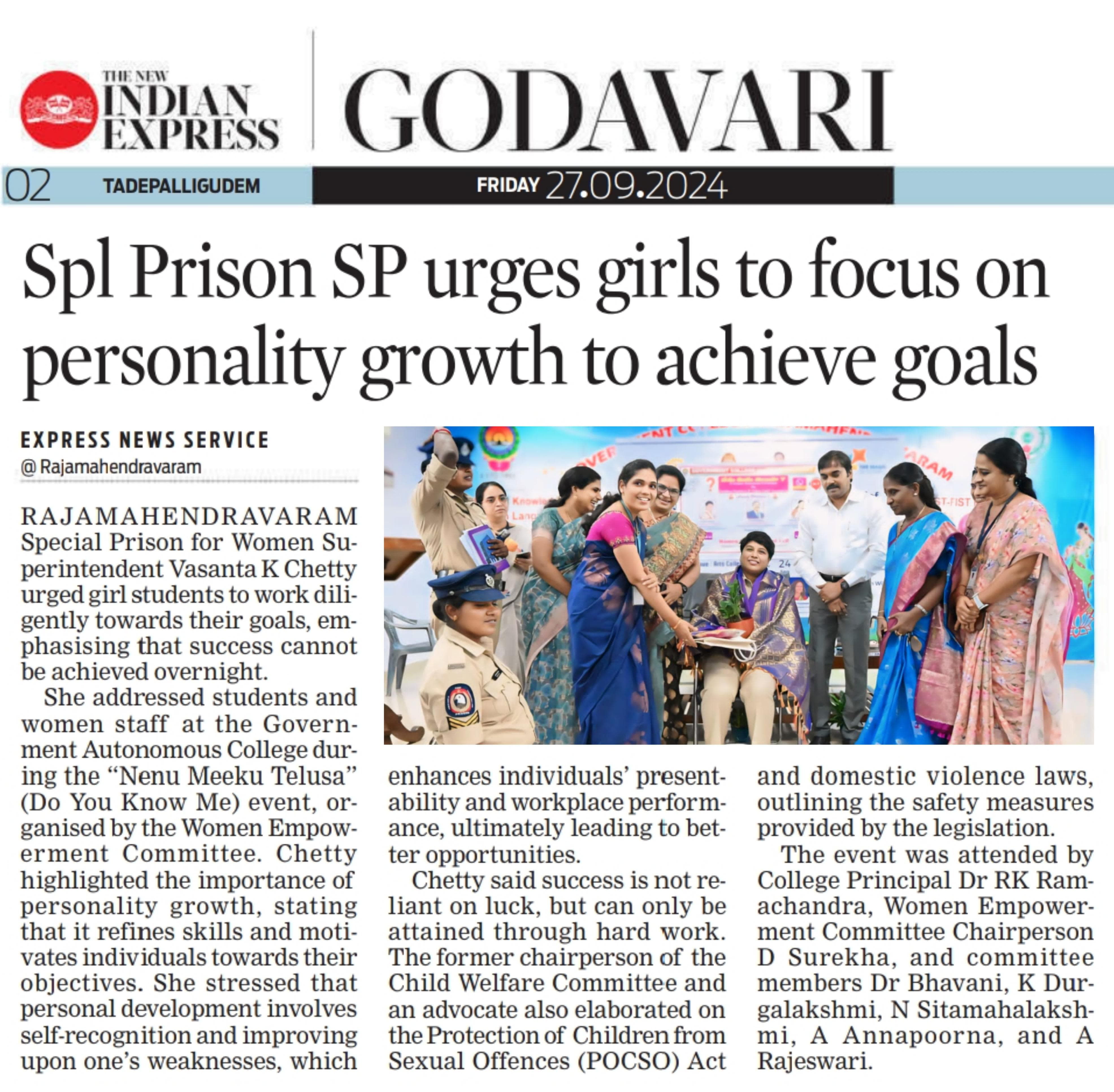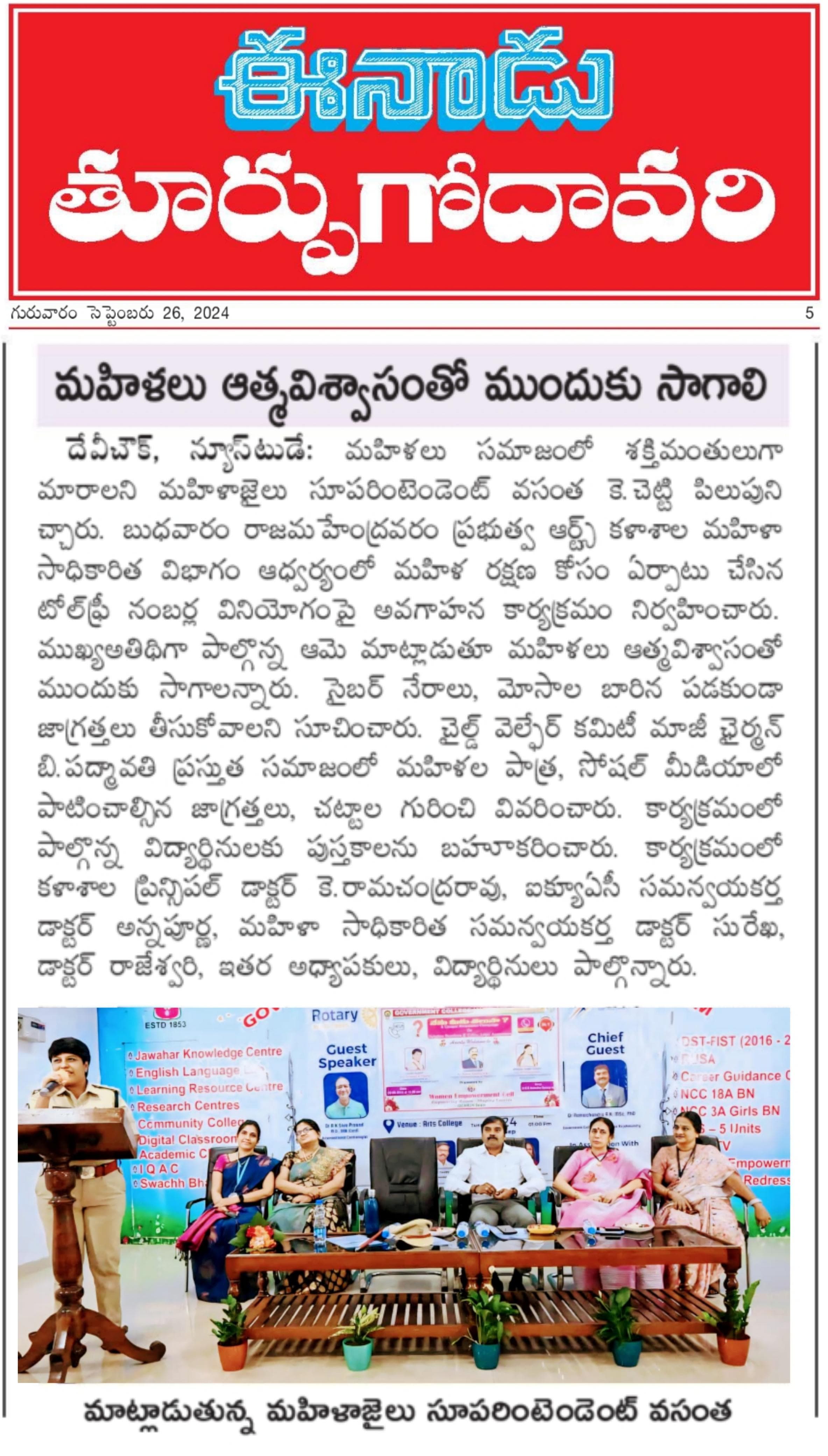 The Women Empowerment Cell organized an awareness programme aimed at educating participants about essential helpline numbers and legal rights pertaining to women. The initiative sought to empower women by providing them with crucial information that can help them navigate legal challenges and seek assistance when needed. Objectives: To raise awareness about various helpline numbers available for women in distress. To provide information on legal rights and protections afforded to women under various laws. To encourage women to seek help and understand the avenues available for support. Programme Highlights Inaugural Session: The programme commenced with an opening speech by Principal sir, who emphasized the importance of awareness in empowering women to take charge of their rights. Guest Speakers: B.Padmavathi a legal expert, discussed the various laws related to women's rights, including domestic violence, sexual harassment, and workplace rights. Vasantha Chetty,Supdt,central prison , shared vital information about the helplines available for women facing violence or harassment. Interactive Session: Participants were encouraged to ask questions and share their experiences. This segment helped to foster a sense of community and support among attendees. Distribution of Resource Materials: Pamphlets containing helpline numbers, legal rights information, and support resources were distributed to all participants. Key Takeaways Helplines: Participants learned about crucial helpline numbers, including local police, domestic violence hotlines, and mental health support services. Legal Rights: The discussion highlighted important legal provisions like the Protection of Women from Domestic Violence Act and the Sexual Harassment of Women at Workplace Act. Empowerment through Knowledge: The session reinforced the idea that knowledge is a powerful tool in fighting against injustices. Conclusion The awareness programme was well-received, with positive feedback from participants who expressed gratitude for the information shared. The Women Empowerment Cell aims to continue such initiatives to ensure that women are well-informed and empowered to seek help when needed. Acknowledgments We would like to thank our speakers, volunteers, and all participants for making this event a success.
